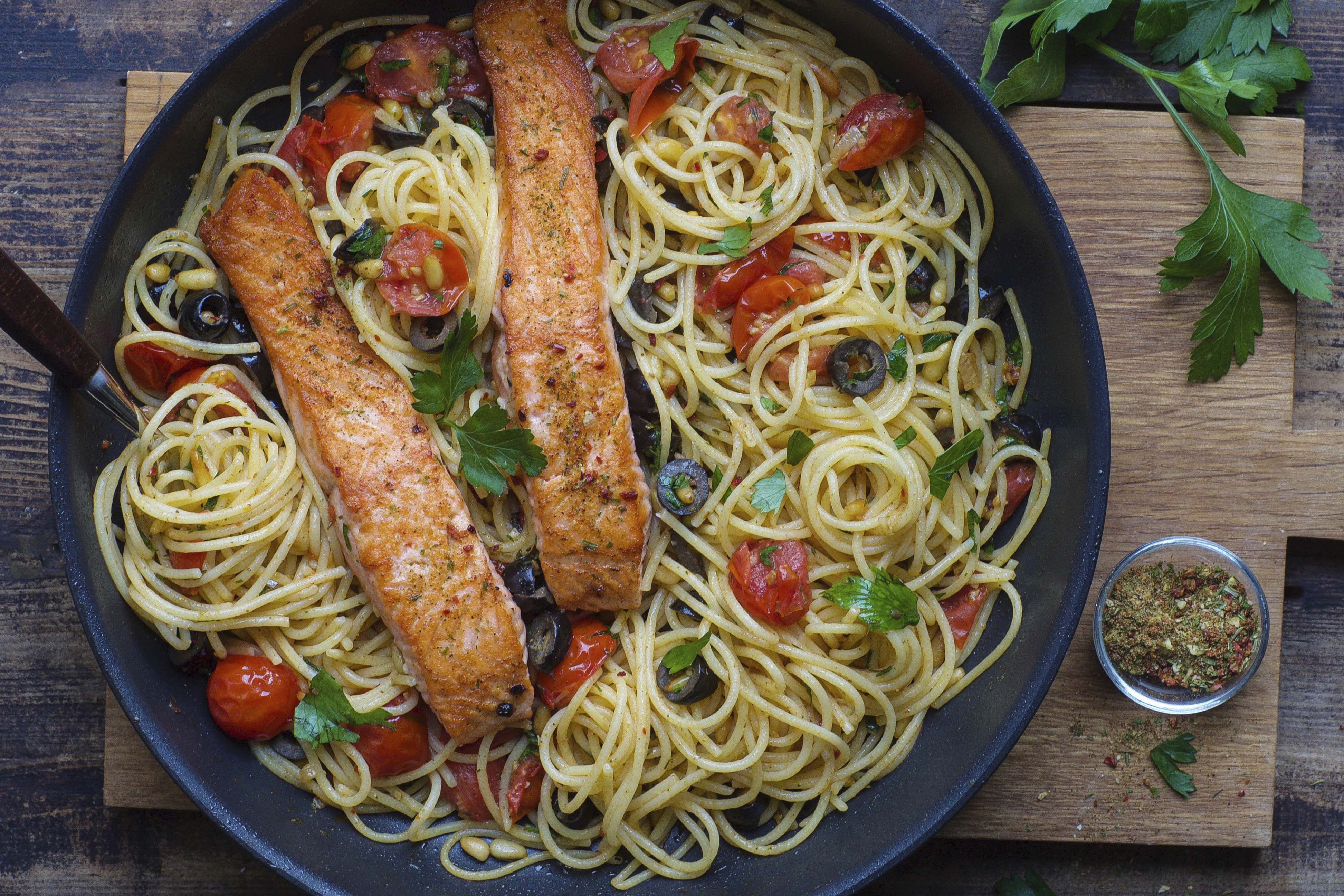 Pasta with salmon and cod